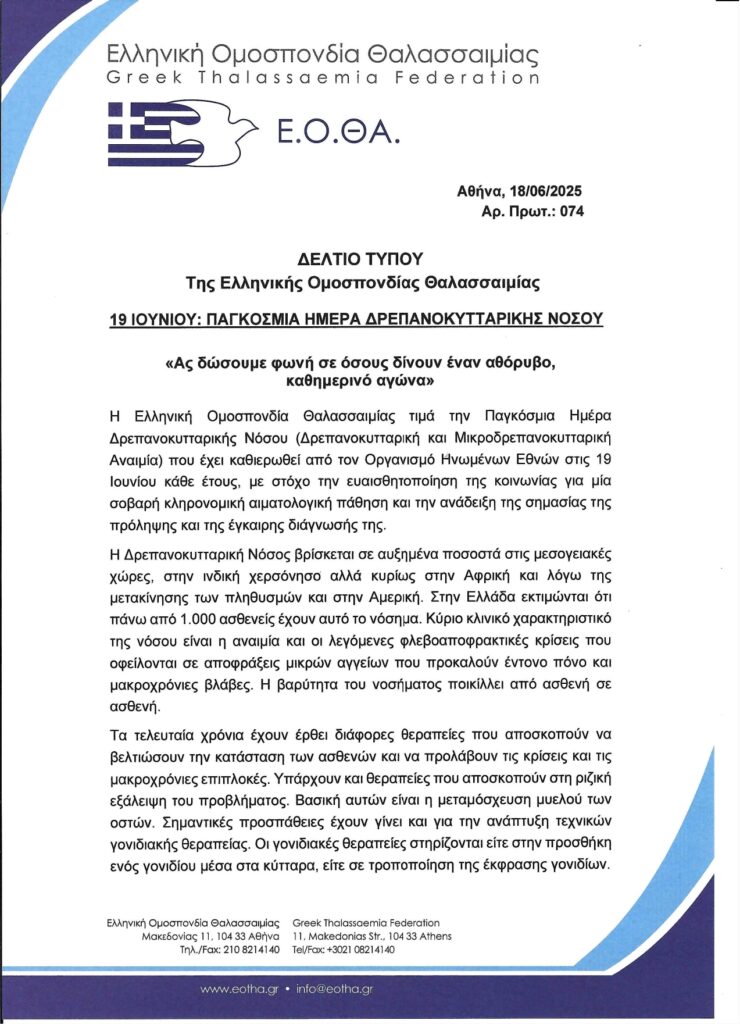 Δελτίο Τύπου-Παγκόσμια Ημέρα Δρεπανοκυτταρικής Νόσου