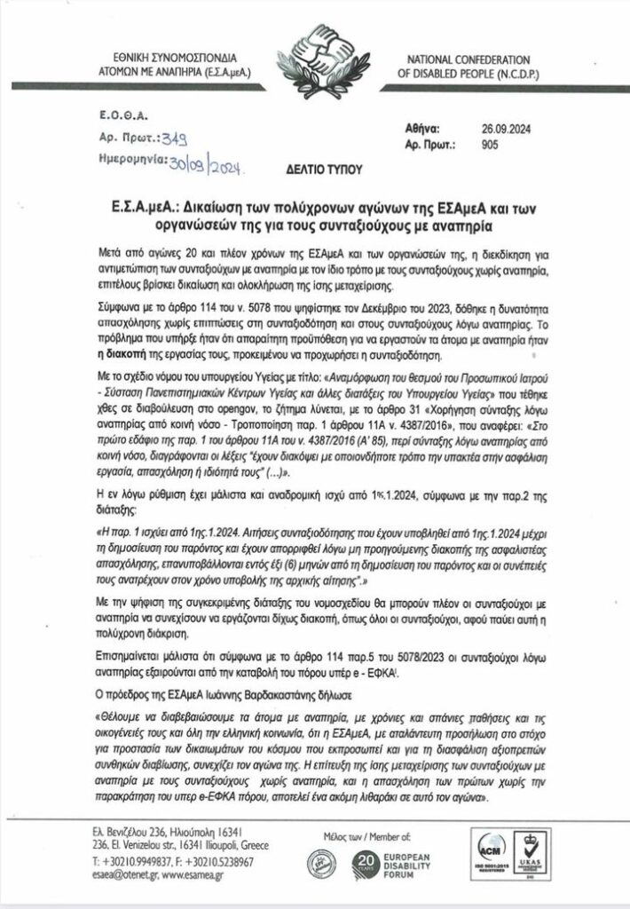 Δικαίωση για τους συνταξιούχους με αναπηρία