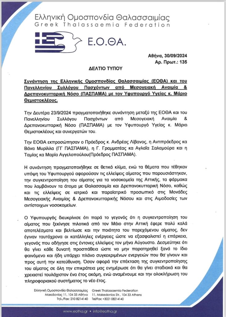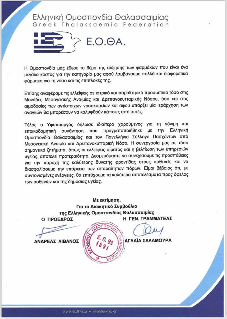Συνάντηση Υφυπουργού Μ. Θεμιστοκλέους με την Ελληνική Ομοσπονδία Θαλασσαιμίας (Ε.Ο.ΘΑ.), τον Παν/νιο Σύλλογο Πασχόντων από Μεσογειακή Αναιμία και Δρεπανοκυτταρική Νόσο (ΠΑΣΠΑΜΑ) και την Παν/νια Εταιρία Προστασίας Πασχόντων από Μεσογειακή Αναιμία (Π.Ε.Π.ΠΑ.Μ.Α.).